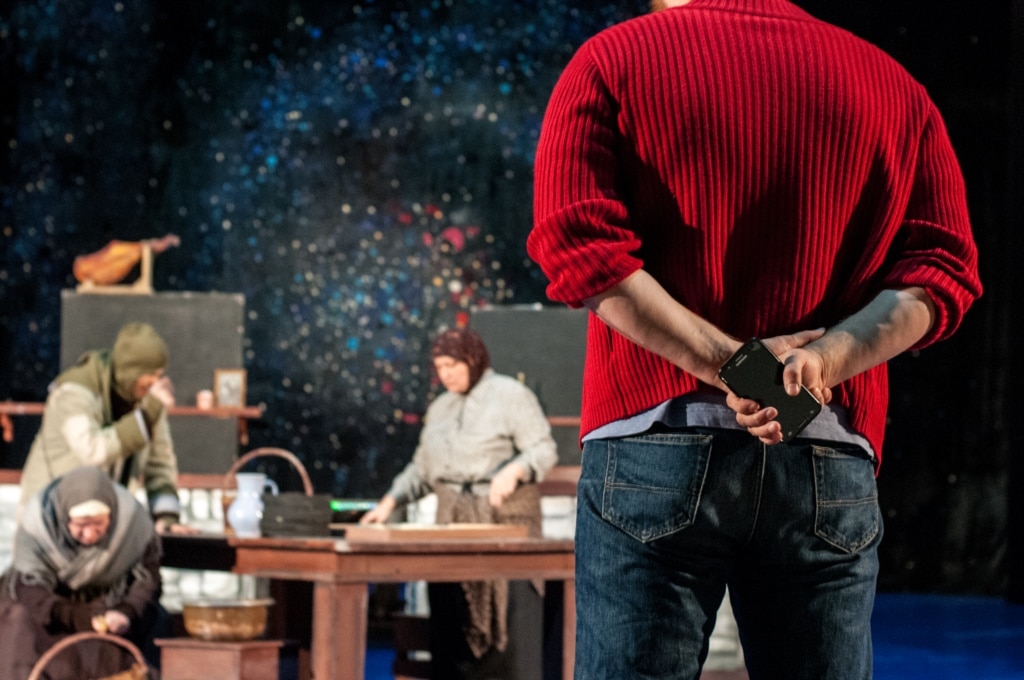 Гучномовець у гримерній оживає – жіночий голос повідомляє, що усі задіяні у репетиції мають зайняти свої робочі місця. Віталій, вже у костюмі, стає.