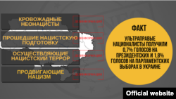 Прокремлівські ЗМІ часто як приклад використовують націоналістичну організацію «Правий сектор» для підкріплення своїх тверджень, представляючи їх як «фашистів» в Україні. Слід нагадати, що вплив цієї політичної партії в Україні близький до нуля, кажуть фахівці. Їхній кандидат на президентських виборах отримав 0,7% голосів виборців. А сама партія на парламентських виборах отримала 1,8% голосів, що набагато нижче за мінімальний поріг для проходження партій в Раду.