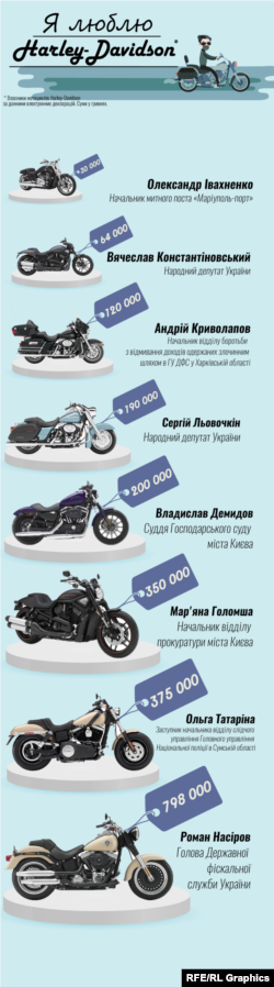 Найдорожчий мотоцикл 2014 року випуску задекларував голова Державної фіскальної служби Роман Насіров. Його дружина Катерина Глімбовська, дочка столичного забудовника, купила Harley-Davidson за 798 тисяч гривень. Окрім того, подружжя володіє солідним автопарком, до якого входять Toyota Camry 2008 року випуску, Lexus LS 600 і Range Rover 2013 року, а також Toyota Land Cruiser Prado 2014 року.