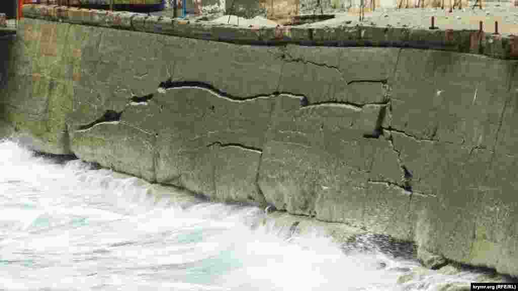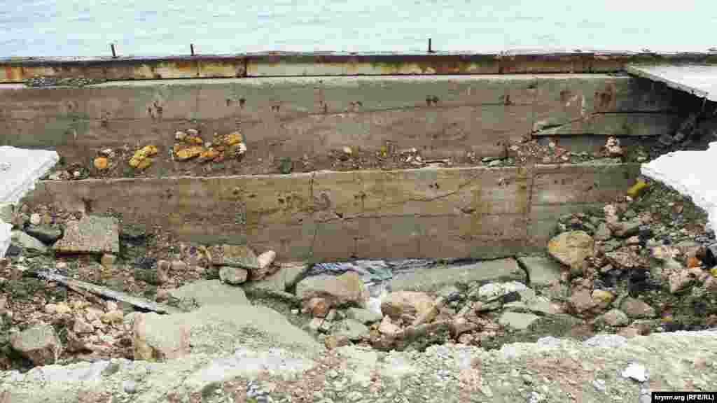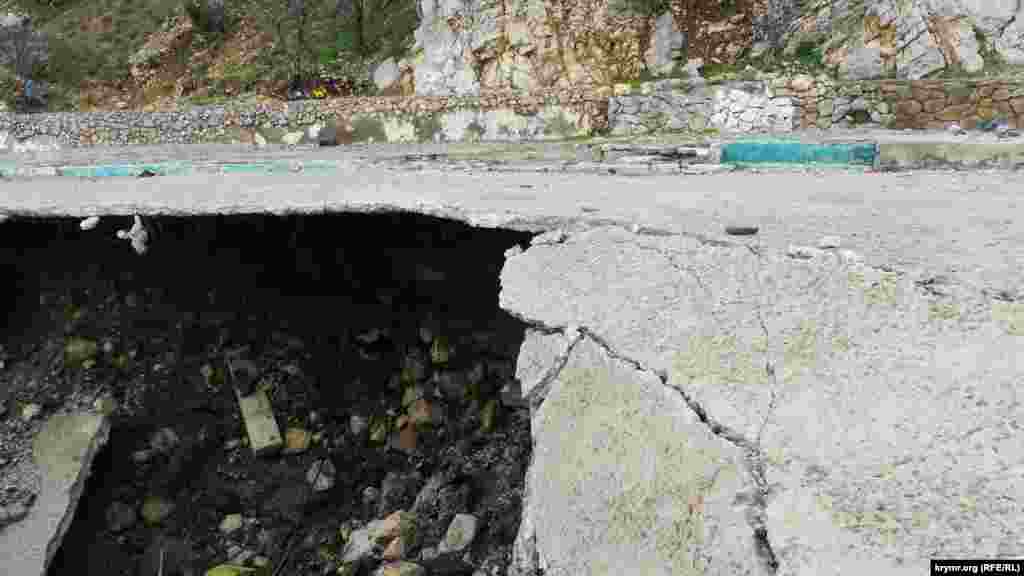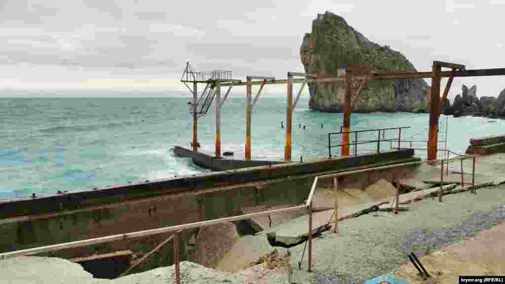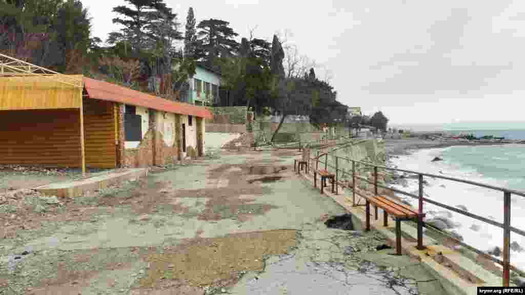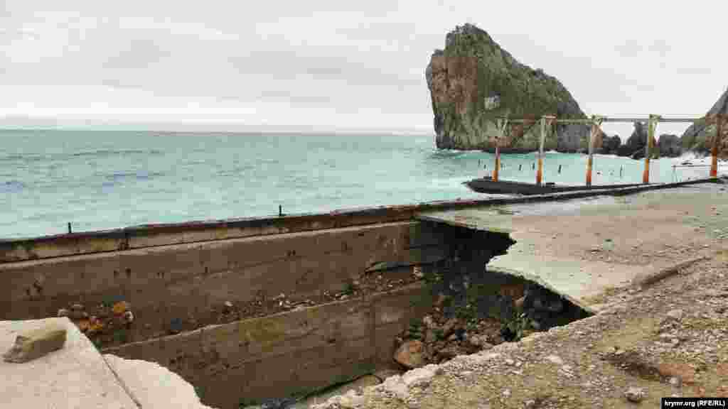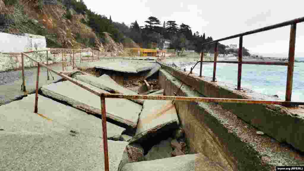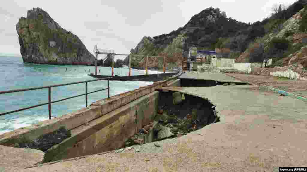 Зламані залізні перекриття колишніх кафе, дірки в асфальті, глибиною у три і більше метрів, рови і купи каміння на пляжі – все, що залишилося від набережної у кримському селищі Сімеїз. Перший обвал тут стався восени 2015 року. У квітні 2016 року голова окупованого Росією Криму Сергій Аксьонов заявляв, що з бюджету буде виділено 20 мільйонів рублів на ліквідацію провалу. Однак роботи так і не почалися. Цієї зими стан набережної погіршився. Тепер вона стала небезпечна для життя.