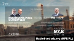 «Пісківський завод скловиробів» на Київщині. Його власники – фонд «Прайм Ессетс Кепітал» Порошенка та фонд «Вік» Кононенка. Безперебійне постачання газу на завод – гарантія сталого виробництва. Увесь 2016 рік завод купував його у фірми Миколи Злочевського – ТОВ «Парі», сплативши за газ майже 100 мільйонів гривень.