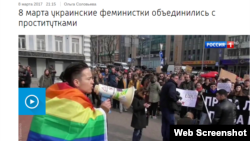 У відеосюжеті показали кадри з феміністичного маршу, що відбувся 8 березня у столиці. Однак, повідомили лише таке: «Міжнародний жіночий день в Україні відзначили маршем феміністок. Під барабанний бій центральними вулицями Києва пройшли представники сексуальних меншин. Загорнувшись у веселкові прапори, українки відстоювали право на одностатеве кохання. У їхній же колоні – працівниці секс-індустрії. Над головою – червоні парасольки. Вони просять не тільки захистити, а й легалізувати проституцію. На учасників маршу напали студенти, намагалися облити зеленкою і кефіром. Поліція затримала чотирьох».