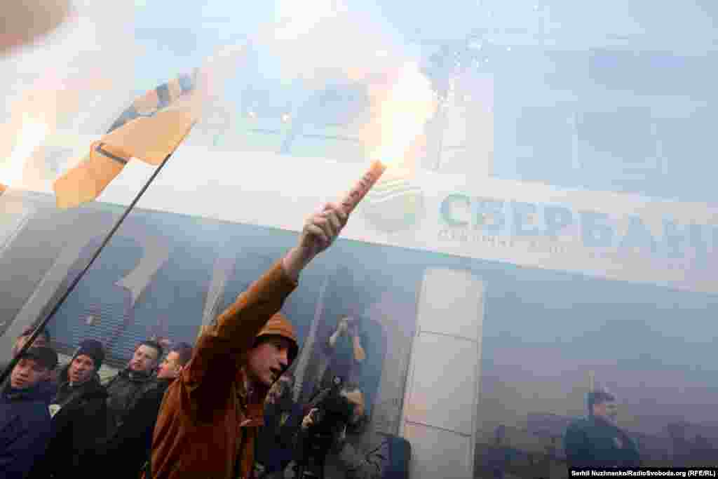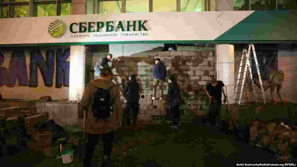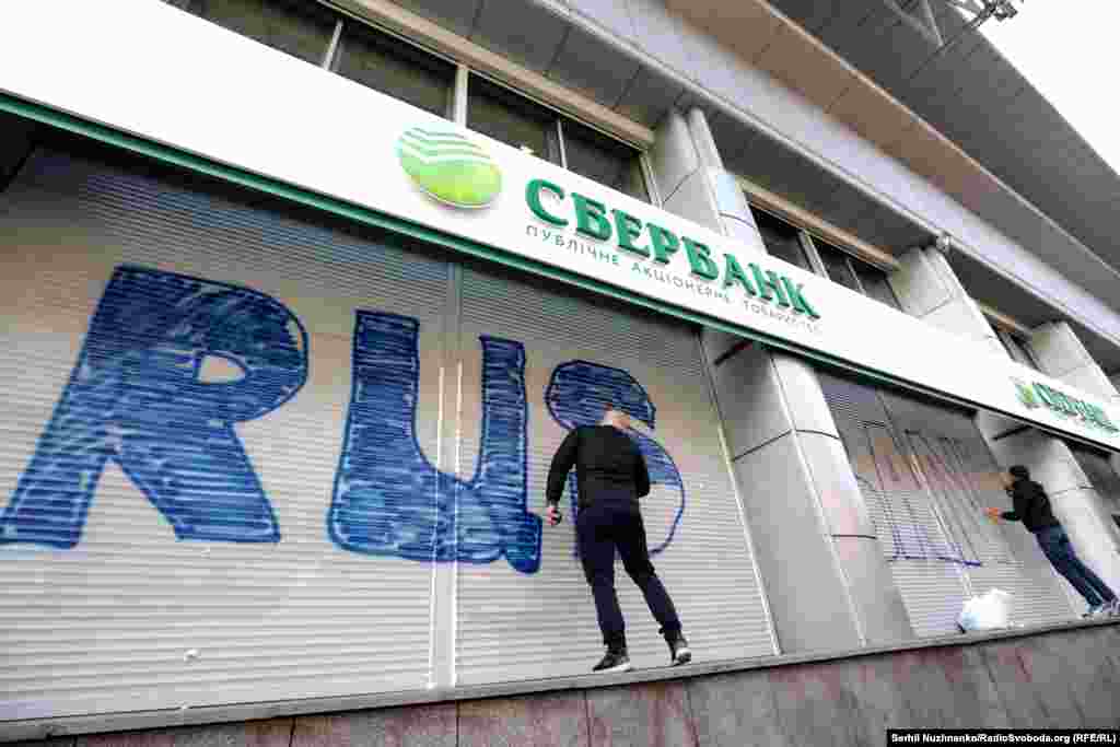 Активісти з прапорами політичної партії «Національний корпус» та «Правого сектору» пікетували головний офіс «Сбербанку» у центрі Києва. Вони замурували центральний вхід до фінустанови бетонними блоками. Минулого тижня «Сбербанк Росії» повідомив, що «готовий до обслуговування осіб, які звернулися з «паспортами» «ДНР» і «ЛНР», у всіх філіях банку». Пізніше агенція «Інтерфакс-Україна» повідомила, що дочірній банк «Сбербанку Росії» в Україні – ПАТ «Сбербанк» – не обслуговує фізичних і юридичних осіб на підставі документів, виданих на непідконтрольних українській владі територіях.