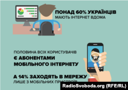 Так, понад 60% українців мають інтернет вдома. Значною мірою полегшили доступ до мережі гаджети. Як свідчить опитування, половина всіх користувачів є абонентами мобільного інтернету. А 14% зазначили, що заходять у мережу лише з мобільних пристроїв.
