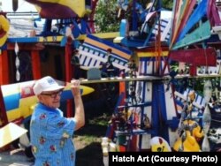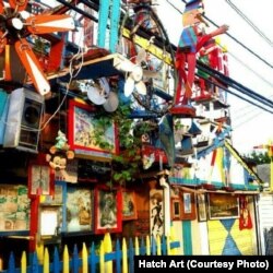Серед кольорових об’єктів є старі, нові, куплені, зроблені вручну. Вони нагромаджені на дахах двох з’єднаних між собою гаражів. До колекції входять пропелери, вентилятори, пластикові коні та масивний, зроблений вручну, реактивний літак. Вирізані з дерева чоловіки в уніформі розміщені під тим, що нагадує ракети, прикрашені різдвяними гірляндами.
