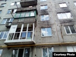 История этого девятиэтажного дома поражала ещё в 2014 году. Он находится у самого выезда из города, и ещё год назад его верхняя часть была полностью снята снарядами – тогда как тут же, этажом ниже, в вечернее время можно было заметить светящиеся окна, в которых люди спокойно ужинали. Сейчас разбитую часть дома удалось отстроить, однако сам дом всё ещё стоит в многочисленных следах от осколков.