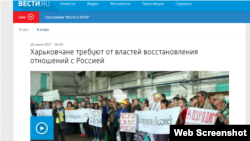 Російська ведуча розповідає: «Жителі Харкова вимагають від влади негайно відновити економічні зв’язки з Росією. Мітинг, на який вийшли 500 осіб, відбувся в понеділок на території місцевого заводу залізобетонних конструкцій. Робочі скандували: «Дайте нам роботу!». Підприємство перебуває на межі розорення. З подібними вимогами до президента Порошенко звернулися вже понад десяток великих виробництв країни».