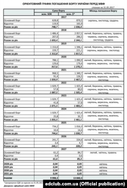 За 2017 рік Україна має виплатити МВФ трохи більше від 1 мільярду доларів. Перша виплата мала відбутися 1 серпня у розмірі 85 мільйонів доларів.