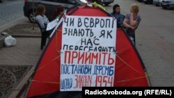 Поначалу Юле полиция не давала установить палатку, говорит она, «мотивируя тем, что это – малая архитектурная форма». Но вмешались депутаты, и палатку установили. Возле нее постоянно дежурят и другие переселенцы. Татьяна Катковская из Алчевска Луганской области рассказывает, что работает с мужем без выходных, но собрать деньги на жилье все равно нереально.