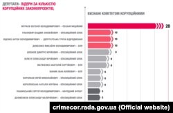 По прізвищах депутатів в антикорупційному комітеті також підбили рейтинг. Лідером за кількістю законопроектів, визнаних корупційними, назвали позафракційного Євгенія Мураєва – 28 проектів.