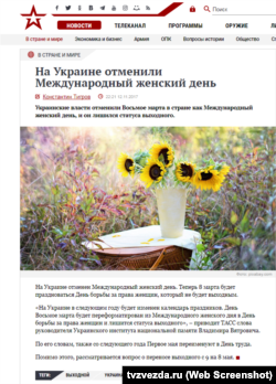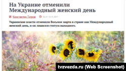 Російський телеканал «Звезда» повідомив у неділю, що українська влада скасувала Восьме березня в Україні як Міжнародний жіночий день, і він позбувся статусу вихідного. Однак, як повідомив Радіо Свобода начальник відділу правового забезпечення Українського інституту національної пам’яті Сергій Рябенко, в Україні наразі не зареєстрований законопроект, що пропонує такі зміни календаря державних свят.