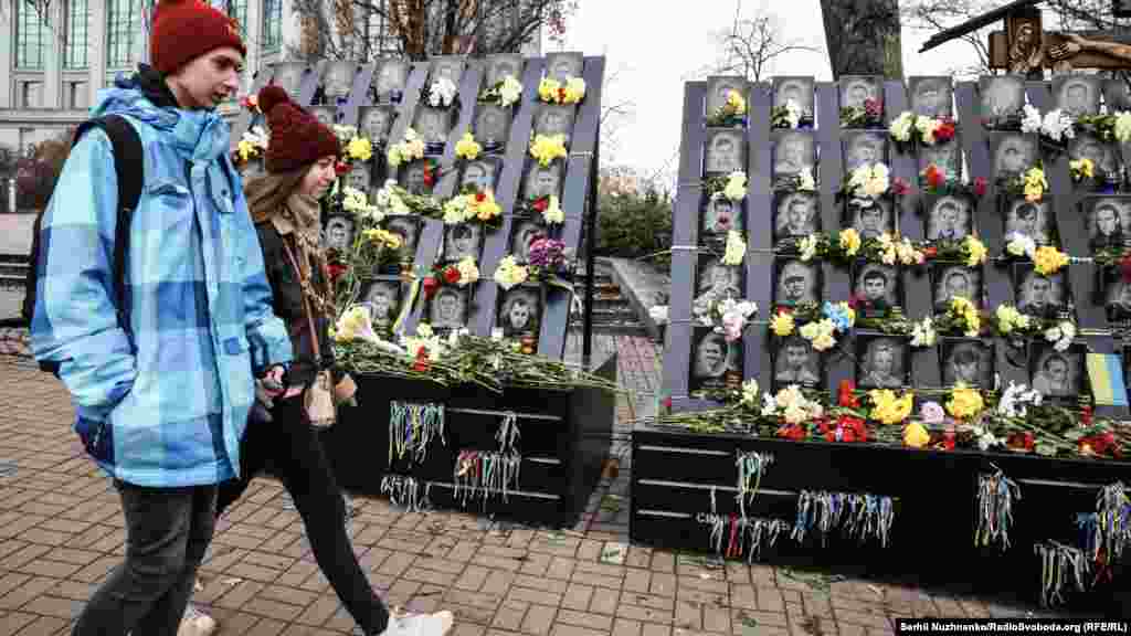 Кияни, очевидці тих подій та родичі полеглих несуть квіти та лампадки до Алеї Героїв Небесної сотні. Біля Хреста пам'яті Героїв Небесної сотні відбувся спільний поминальний молебень, присутні вшанували пам'ять загиблих під час подій 2014-го хвилиною мовчання.