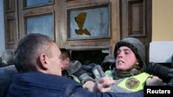 Прихильники екс-президента Грузії, керівника «Руху нових сил» Міхеїла Саакашвілі штурмують будівлю Міжнародного центру культури і мистецтв (Жовтневого палацу) в Києві, 17 грудня 2017 року