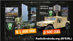 Україна отримала три типи радарів: AN/TPQ–36, його вартість – півтора мільйона доларів, дальність виявлення – 24 кілометри; також –