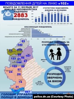 Дети стали больше доверять полиции, об этом свидетельствует количество звонков на горячую линию «102». В 2017 году за 11 месяцев в управление Национальной полиции в Донецкой области позвонило более 2800 тысяч детей. Главная задача – не только выслушать жалобу ребенка, но и удержать его на связи до тех пор, пока по адресу не приедет патруль. Также операторы колл-центра отмечают, дети легко идут на контакт, потому что хотят чувствовать хоть где-то себя защищенными. Раз в семье им это не удается, то пусть «спасут» хотя бы представители полиции. Психологи утверждают: современные дети отличаются от прошлого поколения своей открытостью, а главное – тема о насилии в семье уже не считается закрытой, и дети не боятся обращаться за помощью.