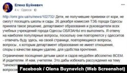 Після зимових канікул маленькі одесити без щеплення від кору не зможуть відвідувати школи та дитячі садки. Таке рішення напередодні Нового року ухвалила, а 4 січня оприлюднила комісія з техногенно-екологічної безпеки та надзвичайних ситуацій при Одеській міськраді. Обмеження діятимуть, поки зберігатиметься несприятлива епідеміологічна ситуація, пояснила Радіо Свобода директорка міського департаменту освіти і науки Олена Буйневич.
