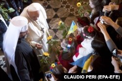 «Вітаємо Вас з відкритим серцем і відчуваємо себе зігрітими батьківською ласкою нашого отця, святішого отця», – промовляє у вітальному слові глава Української греко-католицької церкви Святослав Шевчук. Він представляє великому гостю громаду українських іммігрантів в Італії, яка офіційно налічує близько 200 тисяч осіб, із них третина – молодші від тридцяти років. Блаженніший Святослав висловлює сподівання, щоб наступного разу вітати папу вже на українській землі. Франциск киває головою і посміхається.
