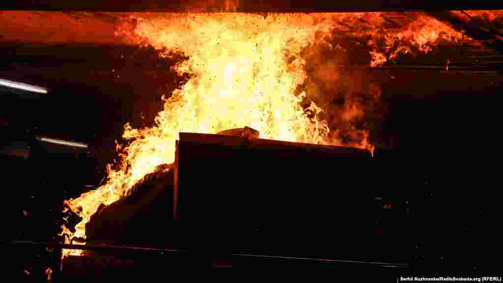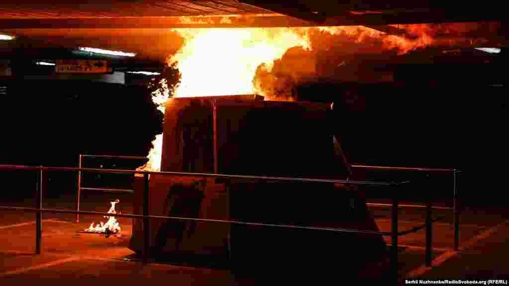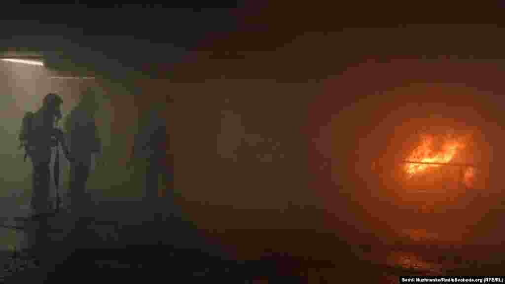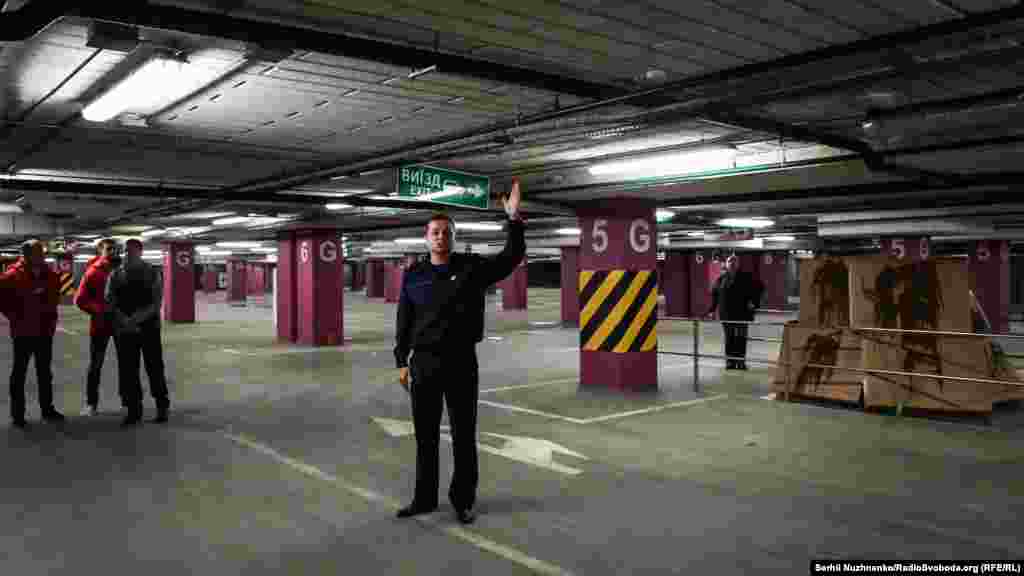 За попереднім планом, у зоні паркування, рятувальники імітують справжню пожежу, підпалюють раніше підготований папір, який загоряється майже миттєво. В якусь мить спрацьовують сплинкери, збігається охорона із вогнегасниками й спецрятівниками. До локалізації пожежі уже долучаються рятувальники, заливаючи місце горіння водою та піною. Дим поступово розсіюється.