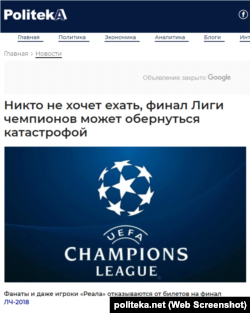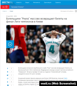 У ЗМІ повідомили, що фанати футбольного клубу «Реал Мадрид» нібито здали свої квитки на фінальний поєдинок Ліги чемпіонів УЄФА в Києві. Натомість, як пише «Громадське», фанати просто не викупили ці квитки. Мер Києва Віталій Кличко також прокоментував ці новини для Радіо Свобода, він стверджує, що це – «фейк-ньюз».