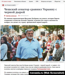 «Чеський сенатор Ярослав Доубрава назвав Україну «чорною дірою» і заявив, що не бажає відвідувати цю країну, поки там не зміниться нинішня влада. Свої думки політик озвучив в інтерв'ю чеському виданню Parlamentni Listy. На думку політика, всі гроші, які Європа відправляє в як допомогу Україні, зникають без сліду і натяків на повернення, що робить цю країну «фінансової чорною дірою», – пише «Звезда».