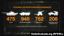 Активне перекидання техніки з Росії, кажуть фахівці, дозволило бойовикам угруповань «ЛНР» та «ДНР» сформувати значну бронегрупу . За даними української розвідки, у бойовиків на озброєнні – 475 танків, близько 1000 бойових броньованих машин, понад 700 артсистем і більш ніж 200 реактивних систем залпового вогню. Озброєння здебільшого радянське.