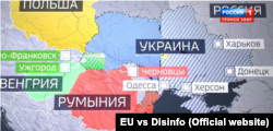 У ток-шоу «60 хвилин», що транслюють на російському каналі, швидким рухом камера «зумиться» в карту України. Ведучий шоу пояснює, що нібито українськими територіями переймаються країни-члени ЄС: Румунія, Польща, Угорщина. «Егоцентрична українськість Києва вже розколола країну», – інтенсивно пояснює ведучий.