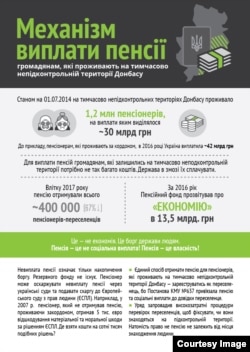 Правительство задолжало жителям неподконтрольной части Донбасса, а также переселенцам около 60 миллиардов гривен песий – таковы подсчеты представителей общественных организаций. По мнению активистов, правительство делает все, чтобы лишить людей их обоснованного законом права на пенсию. Министерство социальной политики издает внутренние постановления, которые обязывают проверять переселенцев-пенсионеров каждые 2 месяца. Только после этого им начисляют пенсию. Это нарушает закон о пенсиях, согласно которому пенсия это частная собственность человека, отмечают активисты. Они вместе с юристами разработали программу, как выплачивать пенсию переселенцам и проживающим на неподконтрольной территории. Лидеры организации «Донбасс SOS», программы «Радник з питань ВПО», фонда «Право на захист» зарегистрировали эту программу в Кабмине и Минсоцполитики.