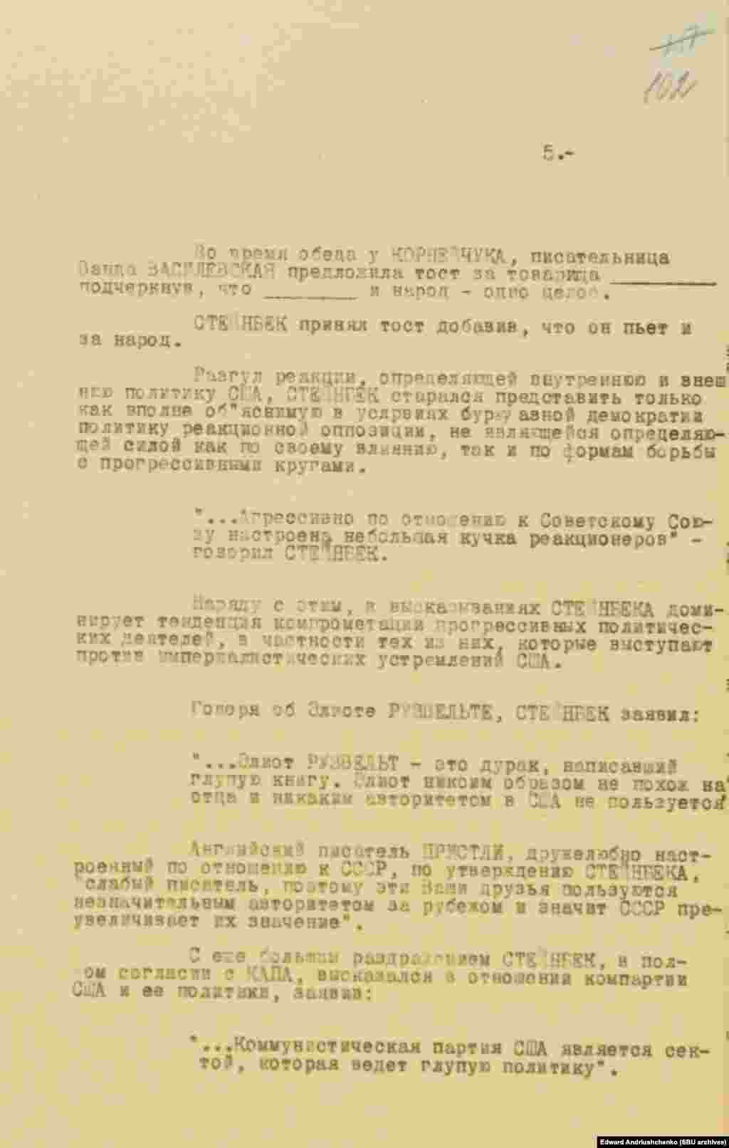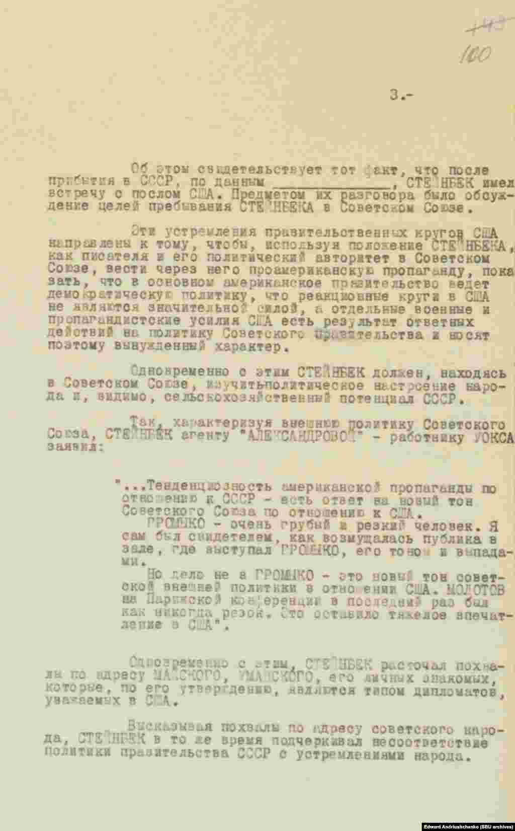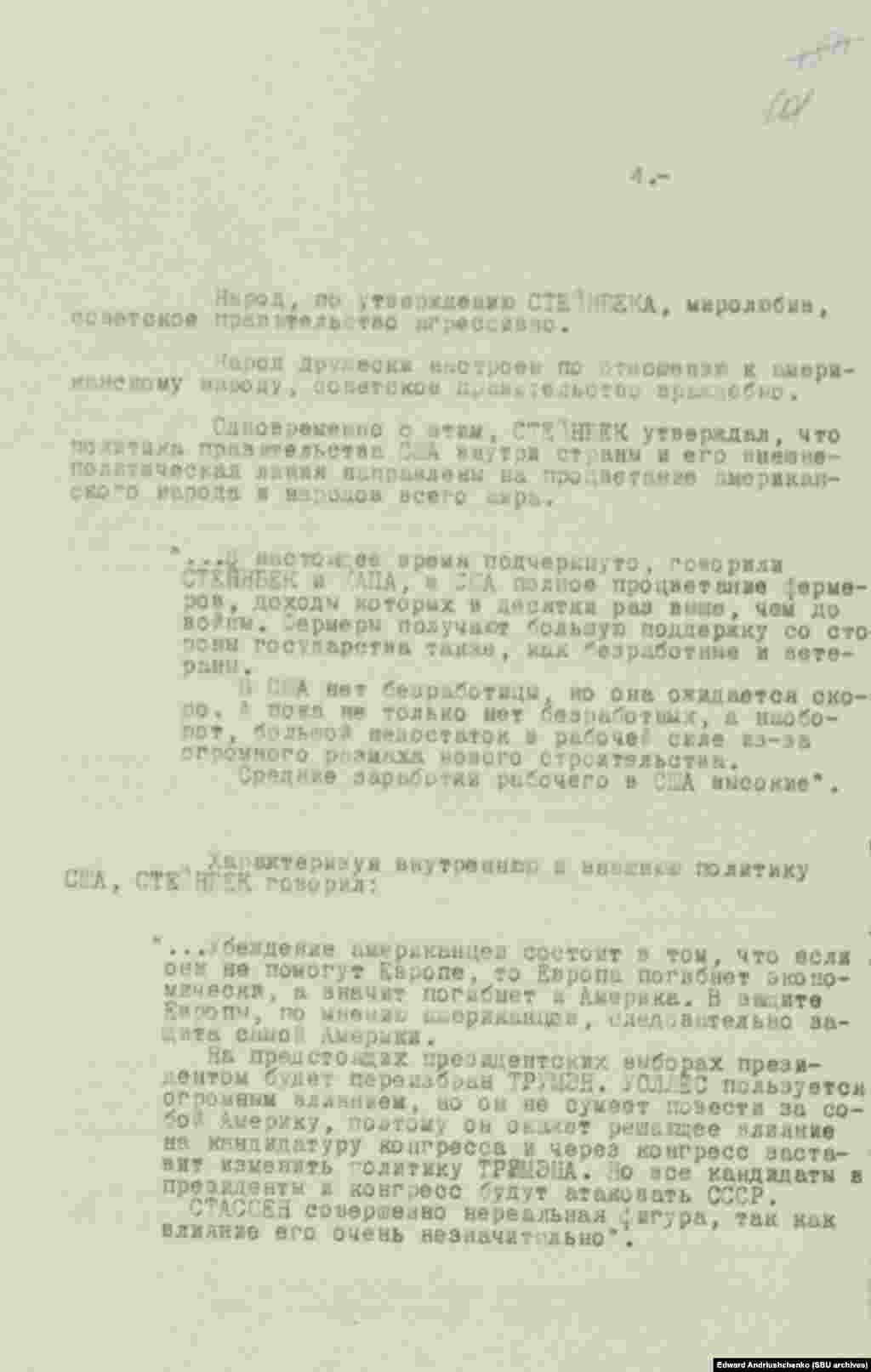Повний текст «Спеціального повідомлення про перебування в Україні американського письменника Стейнбека» МДБ УРСР на семи аркушах