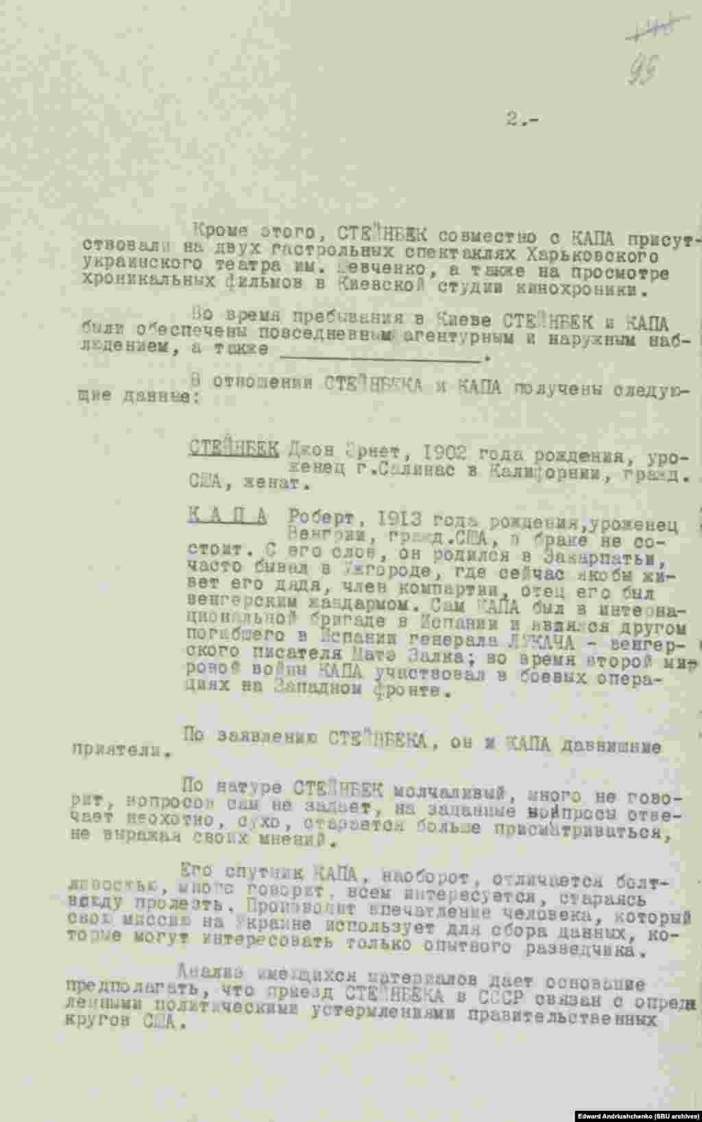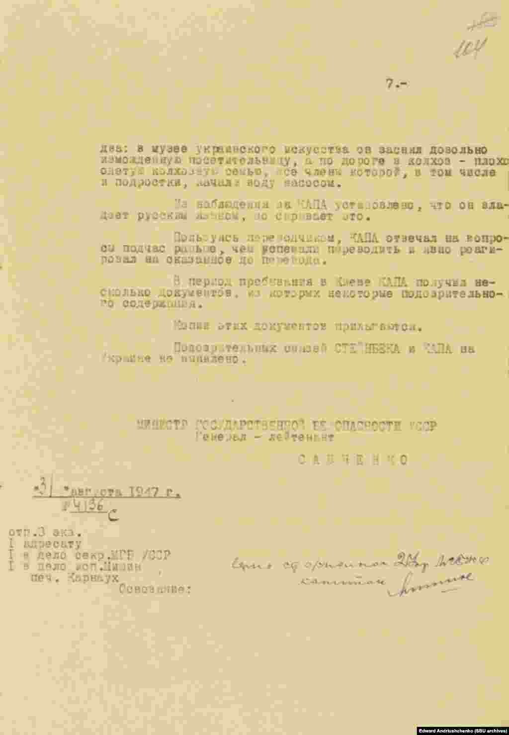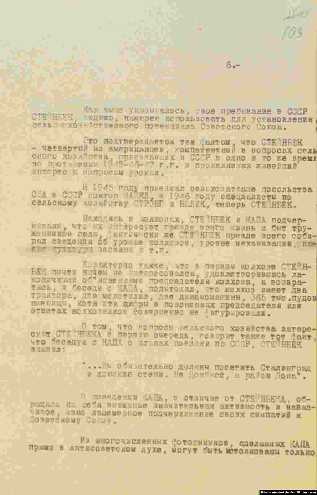 Повний текст «Спеціального повідомлення про перебування в Україні американського письменника Стейнбека» МДБ УРСР на семи аркушах