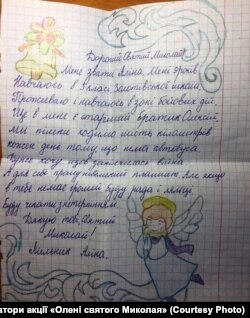 «Я проживаю і навчаюсь у зоні бойових дій. У мене є старший брат Олексій. Ми пішки ходимо шість кілометрів кожен день, тому що нема автобуса. Дуже хочу, щоб закінчилась війна. А для себе прошу невеличкий планшет. Проте, якщо в тебе немає грошей, то буду рада і ляльці», – пише Аліна, якій 9 років