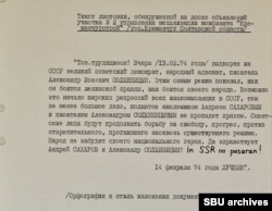 У поштову скриньку запорізького відділення зв’язку кинули листівку з лаконічним текстом: «Хай живе Солженіцин! Геть брежнівців. Демократи».