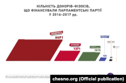Близько 8,5 тисяч громадян у 2016-2017 роках принаймні 1 раз перераховували свої кошти котрійсь із парламентських партій. Загалом шістьом парламентським партіям було перераховано приблизно 32 мільйони гривень від громадян. Ще приблизно 2 тисячі осіб приєдналися до них у першому півріччі 2018 року. Значно менша кількість донорів у позапарламентських партій, і їхня кількість, ймовірно, не перевищує кількох тисяч. Для порівняння, на місцевих виборах 2015 року ми обрали понад 122 тисячі місцевих депутатів. Тож на 12 місцевих депутатів припадає всього одна людина, яка фінансує котрусь із партій.
