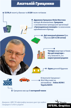 • Анатолій Гриценко, екс-міністр оборони, а нині кандидат у президенти має скромніші статки, порівняно з рештою рейтингових кандидатів.