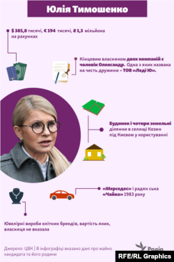 • Юлія Тимошенко, екс-прем’єр-міністр, а нині – лідер партії «Батьківщина» і одна з фаворитів президентських перегонів, багато років поспіль заявляє, що не має значних активів, бізнесу і нерухомості, а частина того майна, яке їй приписують, належить партії.