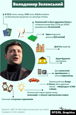 ​Але це не головне. Зеленський і його дружина Олена є співвласниками (від 12,5% до 100%) щонайменше шістнадцяти компаній. Так, у декларації шоумен і кандидат згадує ТОВ «Кіноквартал», ТОВ «Студія Квартал-95», ТОВ «Зеларі Фіш», ТОВ «Продюсерський центр «Ліга сміху», ТОВ «Анімаційна студія 95», ТОВ «Квартал ТВ», ТОВ «Фіш-Хаус», ТОВ «Інвест Аніма», ТОВ «Гауді Студіо», ТОВ «Квартал-концерт». Також у власності Зеленського – кіпрські Aldorante Limited, Vilhar Holdings Limited, Film Heritage Inc (Беліз), San Tommaso S.R.L. (Італія) та MegiritanoVentures Ltd (Британські Вірджинські Острови). Раніше програма «Схеми» (спільний проект Радіо Свобода і телеканалу «UA:Перший») виявила, що Зеленський володіє також бізнесом у Росії – через офшорну компанію, зареєстровану в Белізі «Квартал Леополіс Студіос Лімітед», а також через кіпрську Green Family Ltd, якою він володіє спільно зі своїми бізнес-партнерами, зокрема з Тимуром Міндічем, бізнесменом, якого пов’язують із Ігорем Коломойським.
