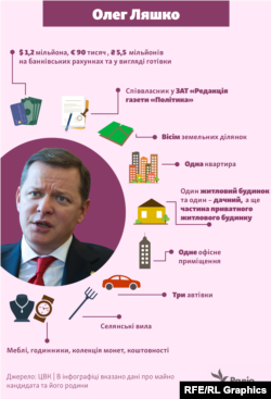 • Олег Ляшко, кандидат у президенти, лідер Радикальної партії свого імені, та його дружина Росіта мають вісім земельних ділянок, одну квартиру, одне офісне приміщення, один житловий будинок та один дачний, обидва – площею близько 300 квадратних метрів, а ще частину приватного житлового будинку. Ляшко навіть окремо задекларував нещодавно збудовану літню кухню.