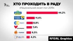 Згідно з даними національного екзит-полу, поведеного на виході з дільниць (станом на 20:00), до Верховної Ради України дев’ятого скликання проходять п’ять партій: