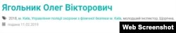 Ягольник є молодшим інспектором Управління поліції охорони з фізичної безпеки у місті Києві.