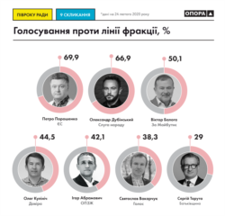 Найбільше проти лінії своєї фракції голосує Петро Порошенко («ЄС»). На другому місці Олександр Дубінський («Слуга народу»), на третьому – Віктор Балога («За майбутнє»).
