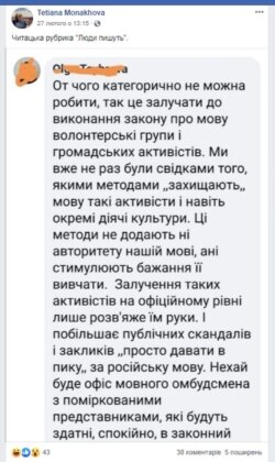 Показовою є рубрика, яку завела на своїй сторінці Тетяна Монахова, під назвою «Люди пишуть». Люди пишуть усіляке – наприклад, про те, що залучати до виконання закону про мову волонтерські групи і громадських активістів «категорично не можна»: «Залучення таких активістів на офіційному рівні лише розв’яже їм руки… І побільшає публічних скандалів і закликів «просто давати в пику» за російську мову».