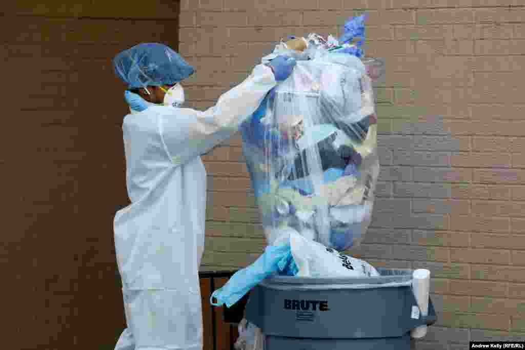 Переповнений використаними масками та рукавичками міський смітник у Нью-Йорку.
