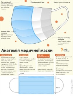 - знімаючи маску, тримайте її за гумки і не торкайтеся лицьової сторони маски; негайно утилізуйте її в контейнер для сміття; обробіть руки спиртом, або помийте їх із милом.