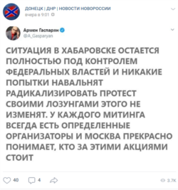 Официальные каналы группировок «ЛДНР» воообще молчат о происходящем в России. Но если промониторить кремлевские паблики в соцсетях, которые работают на аудиторию ОРДЛО, то можно заметить, что они сходу и регулярно начали подавать митинги в Хабаровске в негативном свете.