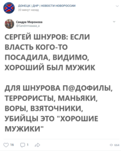 «Вот эти прошмандовки сколько могут рот свой поганый открывать? Это не свобода слова, а пидо...ия какая-то. Каждая шваль подзаборная несёт такую хр..нь. Жаль, что убрали принудительное психиатрическое лечение»