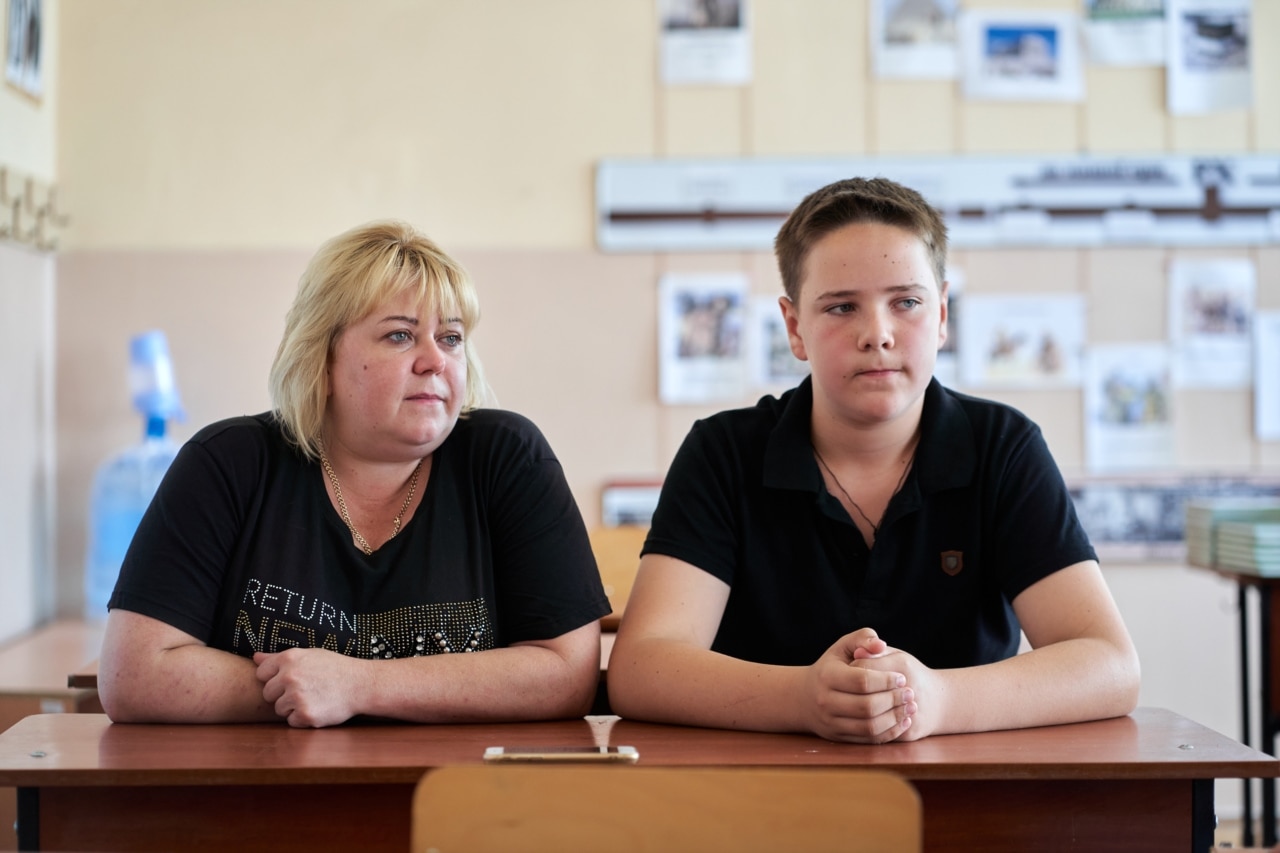 У кабінеті зі скрипучою підлогою за однією партою сидять мама і син. 13-річний Максим Каравашенко та його родина живуть у Слов’янську з 2015 року, коли снаряди формування «ДНР» розгатили двоповерхівку в іще підконтрольному Україні Дебальцевому.