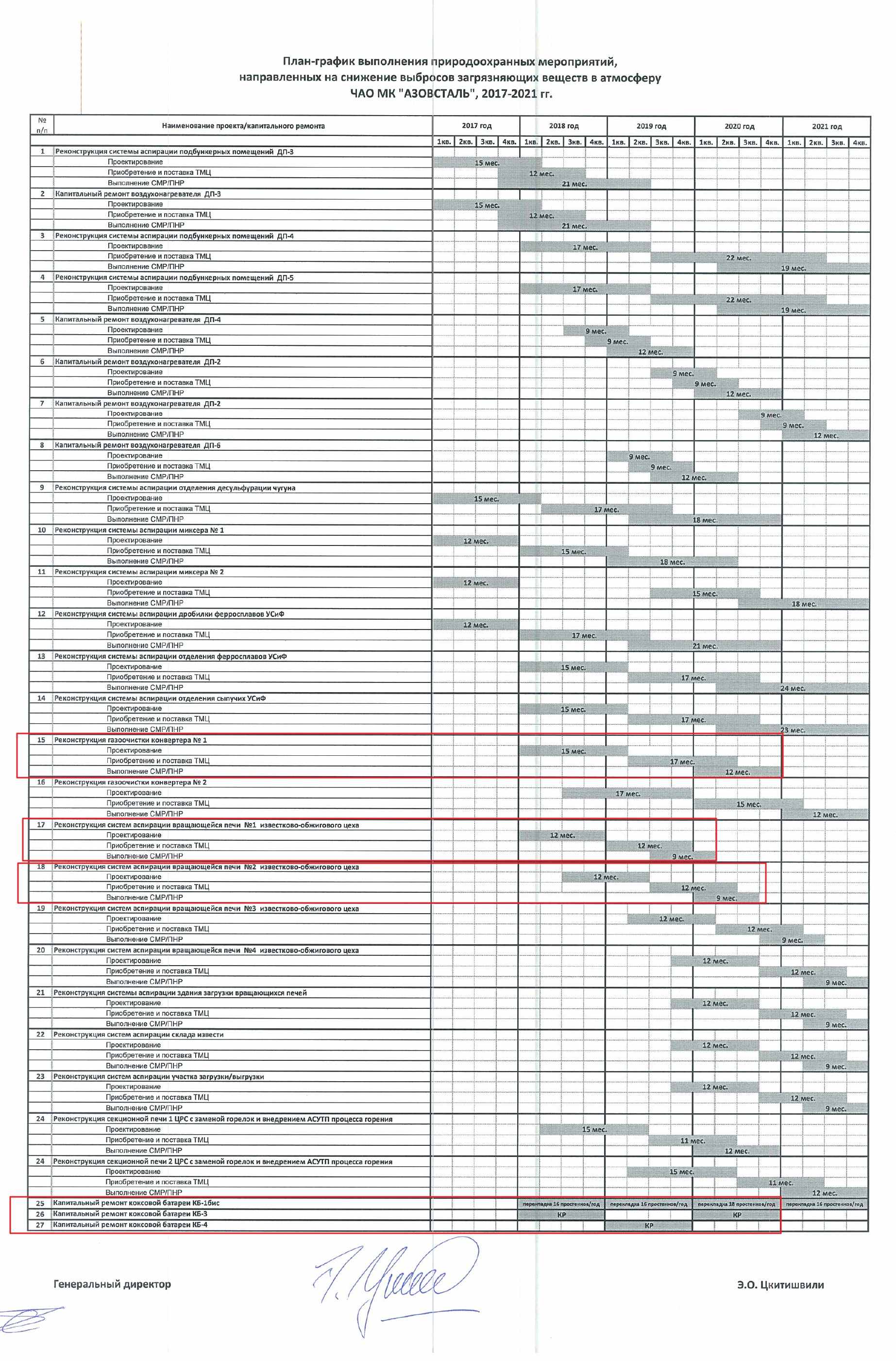 Это стандартная практика последних 25 лет. Самая циничная история с прошлыми разрешениями в том, что глава Донецкой ВГА сыграл на стороне Рината Ахметова. Когда мы требовали внесения сроков модернизации в разрешение, администрация не захотели переделывать документы и предложила комбинатам взять на себя публичные обязательства. Обязательства они взяли, указали сроки, у нас есть официальные письма. Только в этих письмах указано, что модернизация конвертеров «Азовстали» (одного из двух) должна завершиться в конце этого года (здесь график модернизации). На сегодня этого нет и нам даже не могут сказать точных сроков. Даже проект модернизации не закончен.