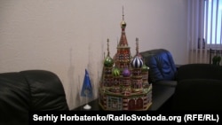 Первый пункт назначения – офисное здание. Ветераны говорят, что тут расположен офис Олега Берко и заодно собираются на совещания члены партии ОПЗЖ. Внутри, кроме сторожа, никого нет. Всеобщее внимание привлекает макет храма Василия Блаженного (расположен в Москве на Красной площади). Рядом с макетом стоит флажок ОПЗЖ.