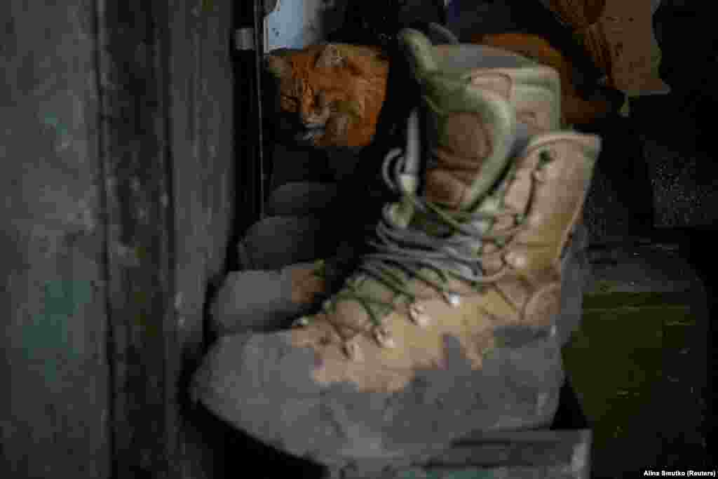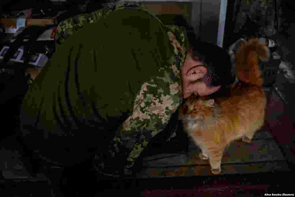 Український військовослужбовець 47-ї окремої механізованої бригади «Магура» грається з котом, якого бійці евакуювали з передової (фото)
