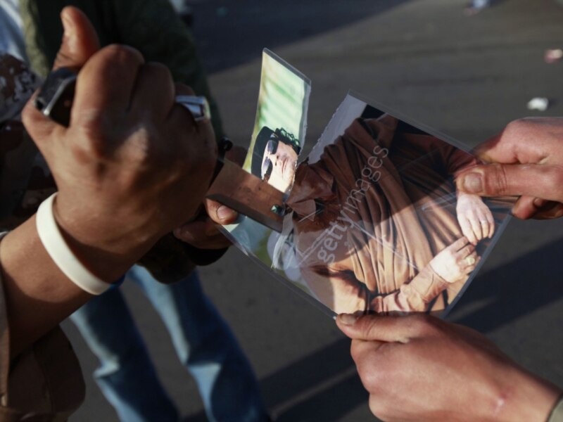 Супротивник Каддафі спалює на демонстрації в Бенгазі його програмовий твір, «Зелену книгу», на тлі старого прапора Лівії часів до перевороту Каддафі 1969 року, який узяли собі повстанці. Фото 25 березня 2011 року