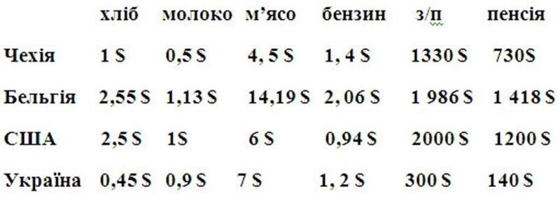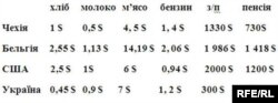 Ми готуючись до програми попросили наших колег, які живуть і працюють в європейських країнах якраз показати, який же той споживчий кошик і як він співвідноситься із заробітною середньою платнею і середньою пенсією. Ось моя колега, Оксана Пеленська підготувала таку невеличку довідку з Праги: